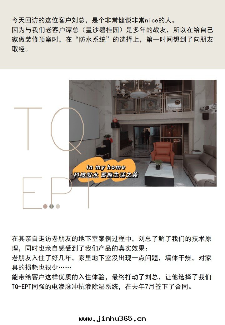 Finally, Mr. Liu was impressed by the excellent check-in experience he could bring to customers, and he chose our tQ-EPT electro-osmotic pulse anti-osmotic dehumidification system, and signed the contract in July last year.