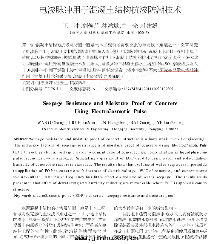Research and experiment on impermeability and dampproof technology of concrete structure by electroosmosis pulse