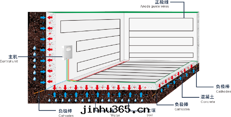 Electroosmosis pulse technology: breaking the traditional waterproof concept, according to the theory of electroosmosis, the intelligent low-voltage multi-pulse technology is adopted to actively discharge the water molecules in the structure to the outside of the structure (in the direction of the negative electrode).