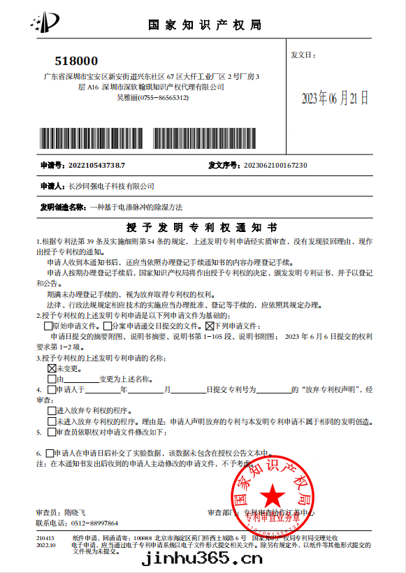 On July 18, 2023, Changsha Tongqiang Electronic Technology Co., Ltd. applied for the invention patent "a dehumidification method based on electroosmotic pulse", which was officially authorized by the State Intellectual Property Office, patent number is ZL 2022 1 0543738.7.