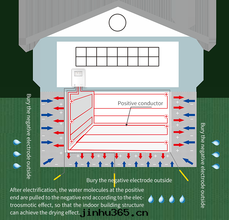 Electroosmotic pulse impermeability and dehumidification technology subverts the traditional impermeability and dehumidification technology, turns passive to active, uses electroosmotic pulse technology to guide the flow of water molecules, excludes the water molecules in the pores in the concrete or brick wall from the structure, adjusts the humidity of the building structure, keeps the wall dry for a long time, but does not crack due to excessive water loss, and truly realizes all-weather protection. Good for moisture-proof basement.