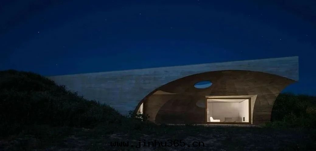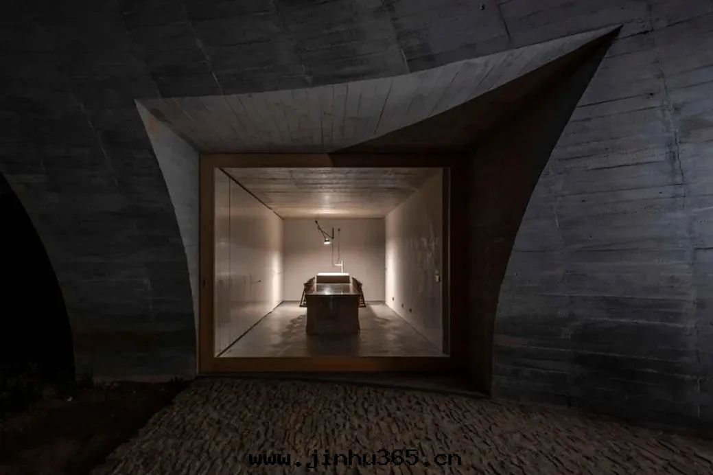 The whole villa is mainly composed of rocks and wood. The opening is designed as a downward concave spherical structure, which perfectly dissolves in the surrounding scene and opens up a unique underground living space.