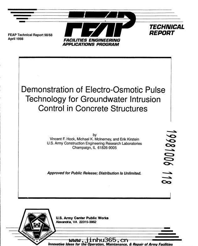 Electro osmotic pulse (EOP) technology has been successfully installed in military structures, such as family houses, deep reinforced structures and tunnels. Electroosmotic pulses are also implemented in civil buildings, such as residential structures, subway tunnels in Washington, D.C., and underground vaults. Electroosmotic pulses have been shown to prevent water from penetrating into underground structures. It can effectively keep the concrete surface at or below 50%, make the treated space dry and the indoor relative humidity low, so as to prevent the growth of mold or mildew. This technology won the 2002 international new star Architecture Innovation Award and was nominated for the cerfpankow award twice (1999 and 2004). U.S.A. S. The research on this technology by the US Army Corps of engineers and the engineering R & D center also won the 2004 army R & D achievement Recognition Award.