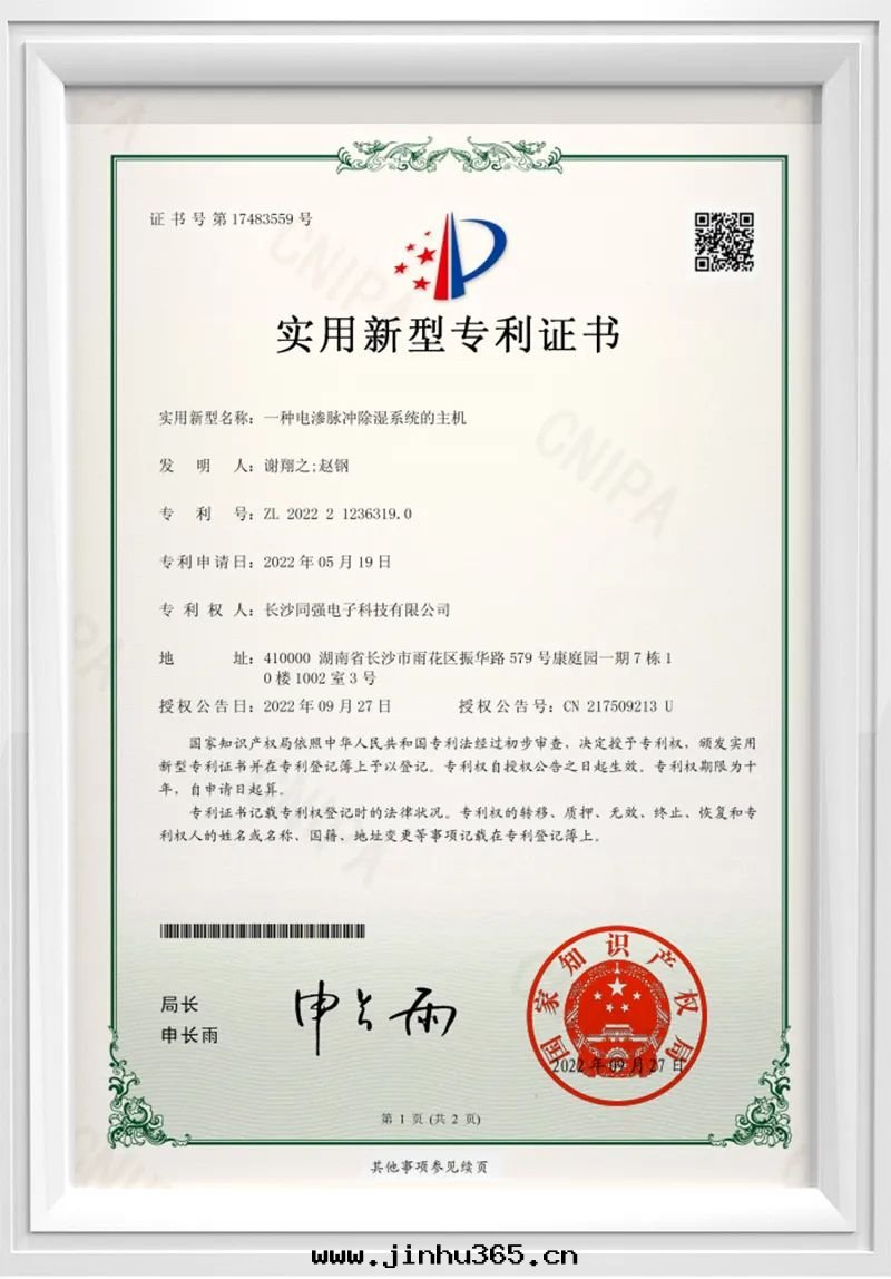 So far, Tongqiang has won 6 utility model patents and 1 design patent! This has also enabled Tongqiang Technology's electroosmosis pulse impermeable dehumidification technology to have an incomparable core competitive advantage in the industry, and the brand development has reached a new level.