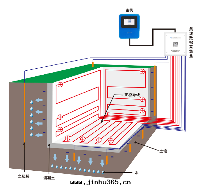 The positive pole is installed in the structure, and the negative pole is installed in the outdoor soil layer. The electroosmotic pulse charge is applied to make the positive water molecules actively move towards the outdoor negative pole, effectively ensuring the dryness and comfort of the basement.
