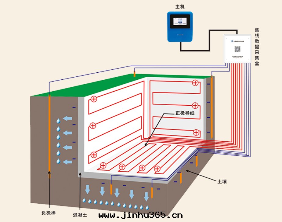Install an anode on the side of the structure that needs to be dried (usually indoors) and a cathode in the soil outside the structure. After electricity, the water in the structure will penetrate and move from the inside of the structure to the outside of the structure, so that the structure remains dry.