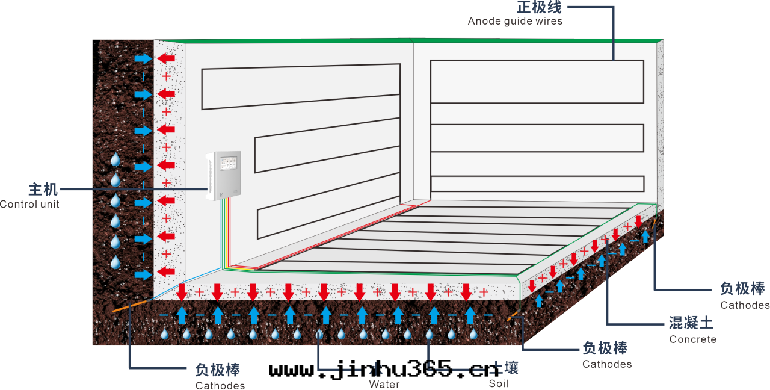 電(diàn)滲脈沖技術(shù):打(dǎ)破傳統的防水(shuǐ)理(lǐ)念,根(gēn)據(jù)電(diàn)滲透理(lǐ)論,采用(yòng)智能(néng)低(dī)壓多(duō)脈沖技術(shù),主(zhǔ)動(dòng)将結構中(zhōng)的水(shuǐ)分子排到結構的外(wài)側(負极(jí)方(fāng)向(xiàng))。