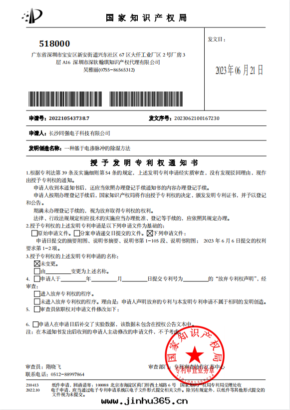 2023年(nián)7月(yuè)18日(rì),长(cháng)沙(shā)同(tóng)強(qiáng)電(diàn)子科技有(yǒu)限公(gōng)司申請的發(fà)明(míng)专利 “一(yī)种基于(yú)電(diàn)滲脈沖的除湿方(fāng)法(fǎ)”,被(bèi)國(guó)家知識産權局正式授權,专利号(hào)为(wèi)ZL 2022 1 0543738.7 。