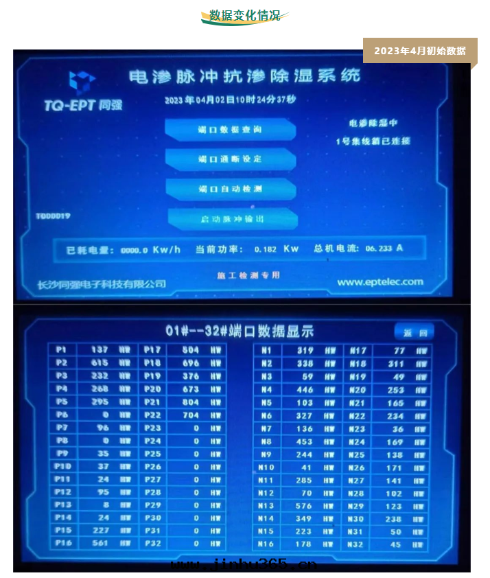 同(tóng)強(qiáng)電(diàn)滲脈沖抗滲除湿系(xì)統,正式挂機(jī)運行3个(gè)多(duō)月(yuè),对(duì)比初始(shǐ)檢測數據(jù),下(xià)降非(fēi)常明(míng)显!